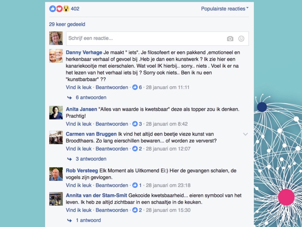 Er valt veel te zeggen over het ontwikkelingsproces dat we met elkaar hebben doorlopen. Op deze website vind je een verzameling van inzichten vanuit verschillende perspectieven, vanuit de onderzoekers, de professionals, docenten en studenten. De aard van de bijdragen is dan ook heel verschillend. Dat nodigt, zo hopen wij, uit tot dialoog. Daarom is er ook een forum op deze website te vinden waarin we, eigen aan de doelstellingen van Ruimte voor dialoog, gezamenlijk verder kunnen bouwen aan kennis over het stimuleren van betekenisvolle interactie op sociale media die bijdragen aan het versterken van het maatschappelijk belang van de kunsten.
