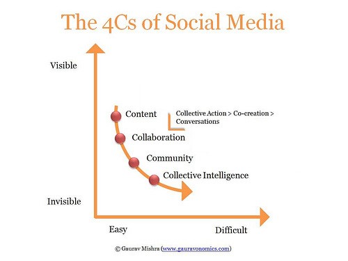 We spreken dus pas van een community wanneer er meer gebeurt op sociale media dan alleen het creëren en aanbieden van content. Een belangrijke voorwaarde is dat er samenwerking tussen professionals en gebruikers en/of gebruikers onderling plaatsvindt. De meest minimale vorm van samenwerking is die van het co-creëren van content en het aanzetten tot conversatie over die content. Het is een manier van werken die je in de praktijk vaak tegenkomt: interactie op sociale media wordt opgevat als ‘liken, delen en comments publiceren’. Mishra ziet dit type activiteiten op sociale media als zichtbaar en relatief gemakkelijk realiseerbaar. Ze staan dan ook als eerste genoemd het model The 4 Cs of Social Media dat hij ontwikkelde: