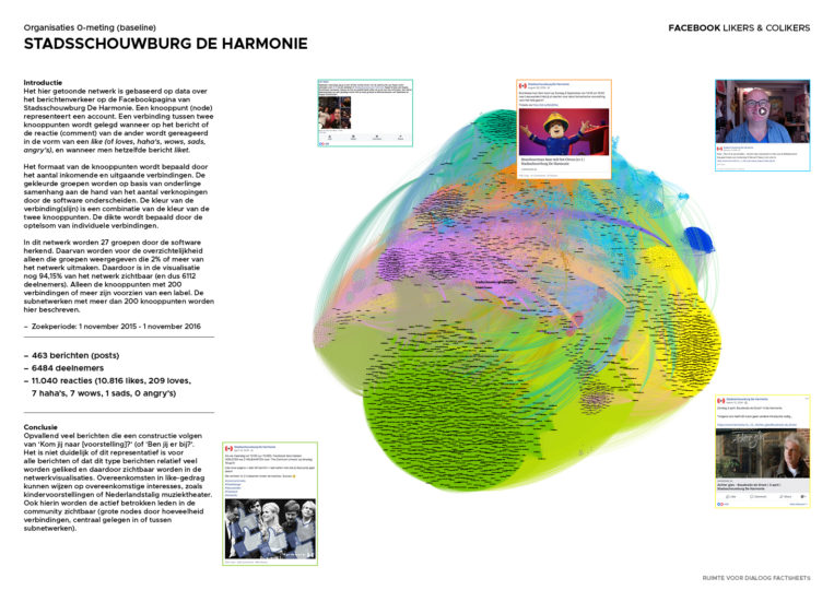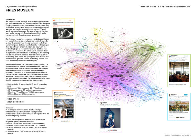 Hieronder vindt u voor de organisaties Keunstwurk, Tryater, het Fries Museum en de Stadsschouwburg De Harmonie, de 0-meting van socialmedia berichten uit de beginperiode van het onderzoekstraject. Via de links hieronder zijn ook de bestanden in te zien van de 1e en 2e (en in sommige vallen 3e meting). Omdat er persoonsgevoelige gegevens in de factsheets zijn verwerkt (zie ook het artikel over de waarde van netwerkanalyses), is een gedetailleerde versie versleuteld met een wachtwoord. Deze kunt u opvragen door contact op te nemen met Floris de Jonge. Deze factsheets zijn gebruikt om de uitkomsten van de netwerkanalyses op te baseren zoals die zijn verwerkt in de artikelen .