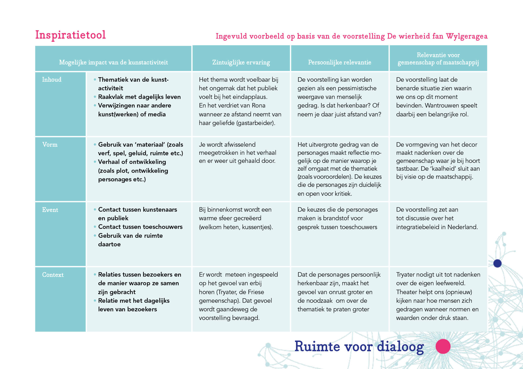 Je organiseert een kunstactiviteit en zoekt naar handvatten om de impact die de kunstenaars beogen te concreet te maken zodat je er content over kunt maken. De inspiratie-tool helpt de de kenmerkende eigenschappen van de kunstactiviteit en mogelijke impact in kaart te brengen. Daarop volgt de vertaalslag naar content die aanzet tot dialoog.